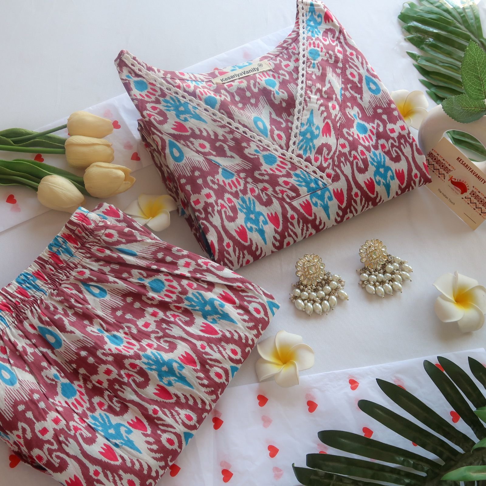 The set is completed with matching straight-cut pants, featuring the same brown base and coordinating ikat prints, offering a seamless and chic look. Perfect for casual outings, festive occasions, or work wear, this set combines color, comfort, and timeless style effortlessly. Â