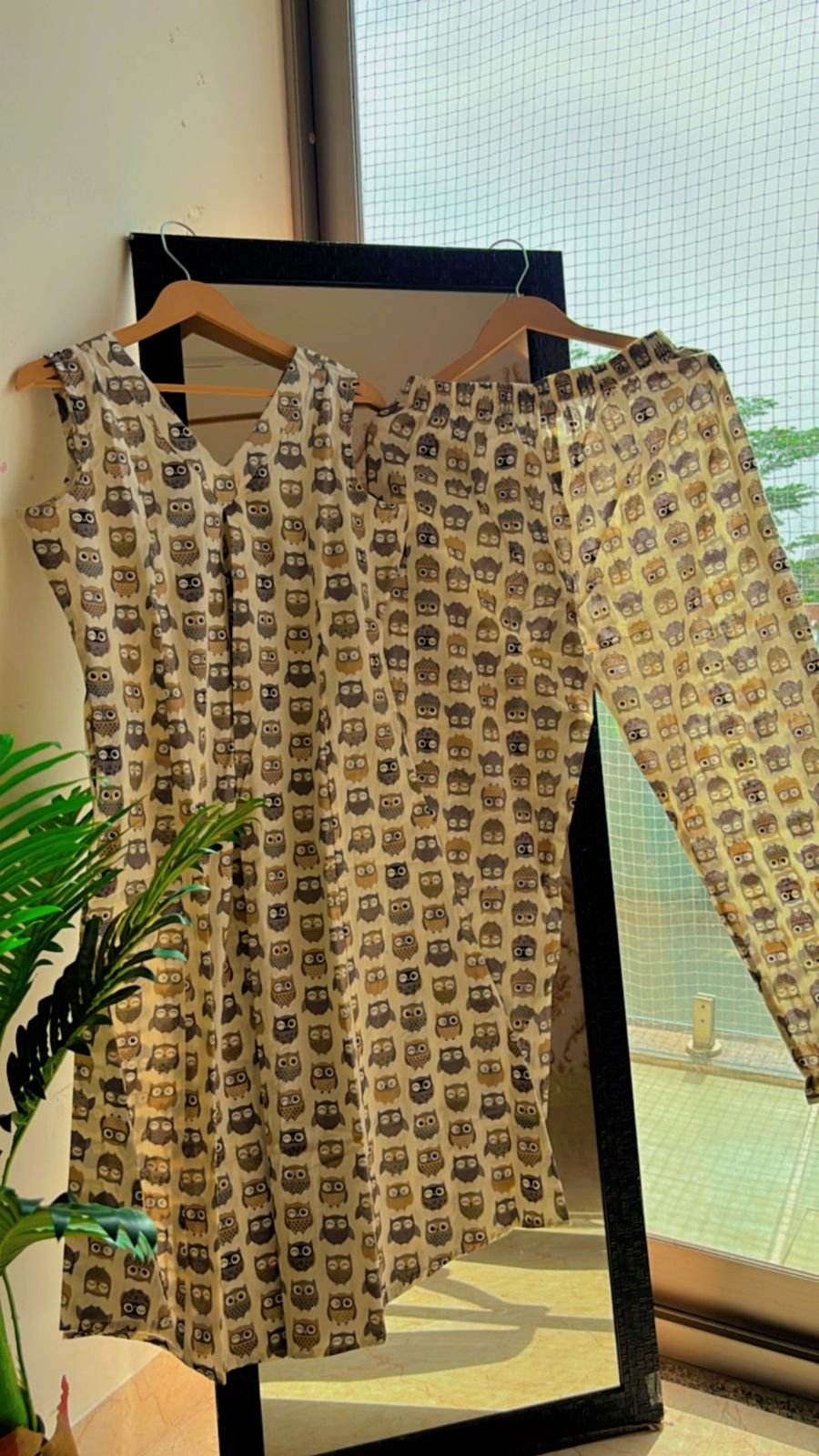 Step into the world of comfort and charm with our pure cotton comforter kurta pants sets, where style meets whimsy in every stitch. Our kurta, in a soft off-white hue, serves as the canvas for adorable brown and dark brown owl prints, adding a touch of playful elegance to your ensemble.