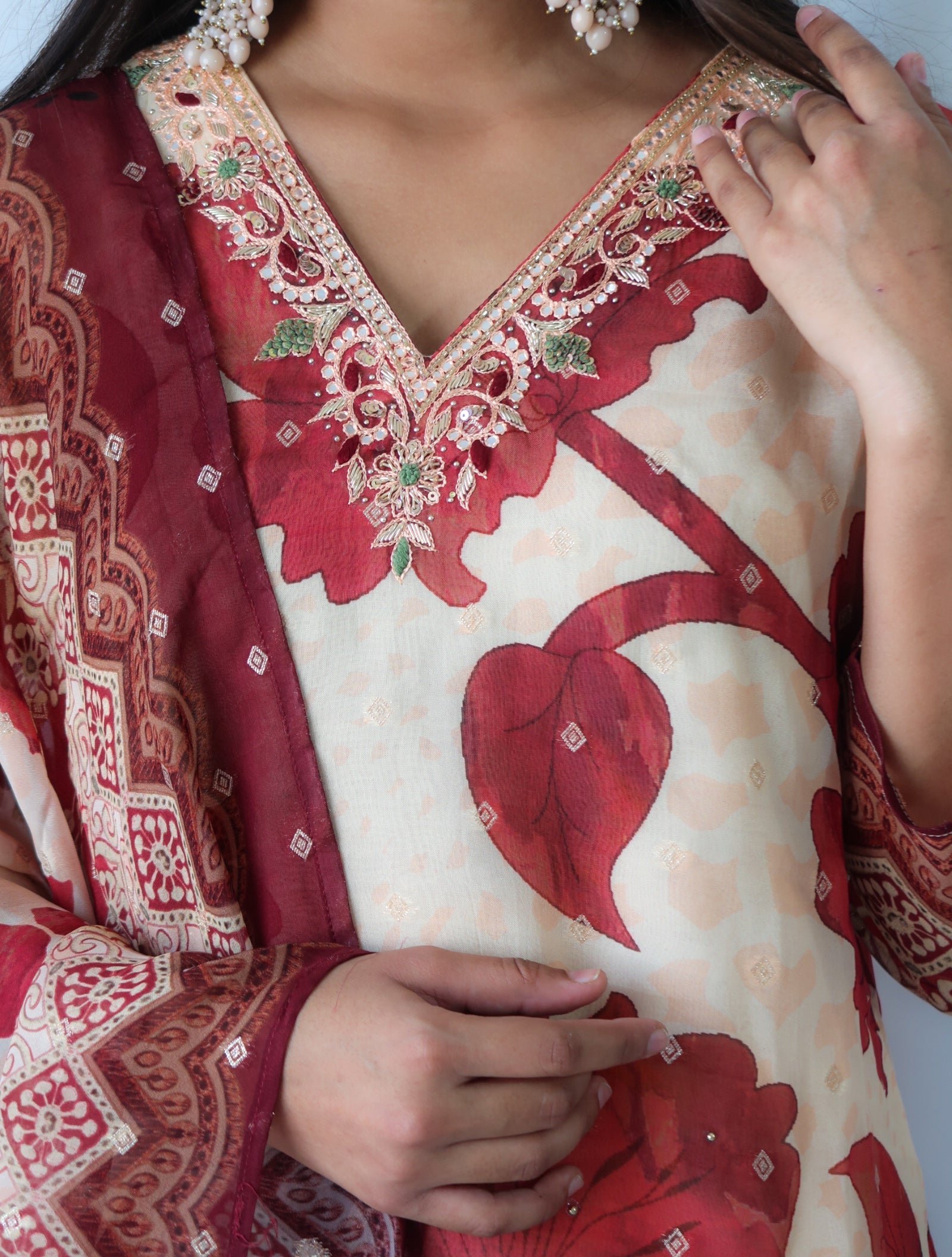 Introducing our Premium Three-Piece “Maroon Petals Suit Set,” a perfect fusion of elegance and traditional craftsmanship. The off-white kurta is adorned with beautiful maroon floral prints, thoughtfully spaced to create a refined and graceful look. The V-neckline is enhanced with intricate sequin, moti, and pittan work, adding a touch of luxury and sparkle.
