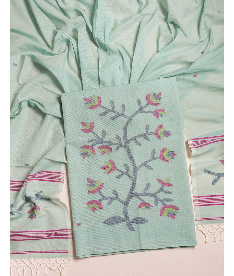 Experience the elegance of traditional craftsmanship with this pure cotton handloom Jamdhani suit set. Woven with meticulous care, the breathable cotton fabric ensures comfort while the intricate Jamdhani patterns add timeless sophistication, making it ideal for both festive occasions and everyday wear. This suit set offers a refined blend of style, comfort, and heritage artistry.